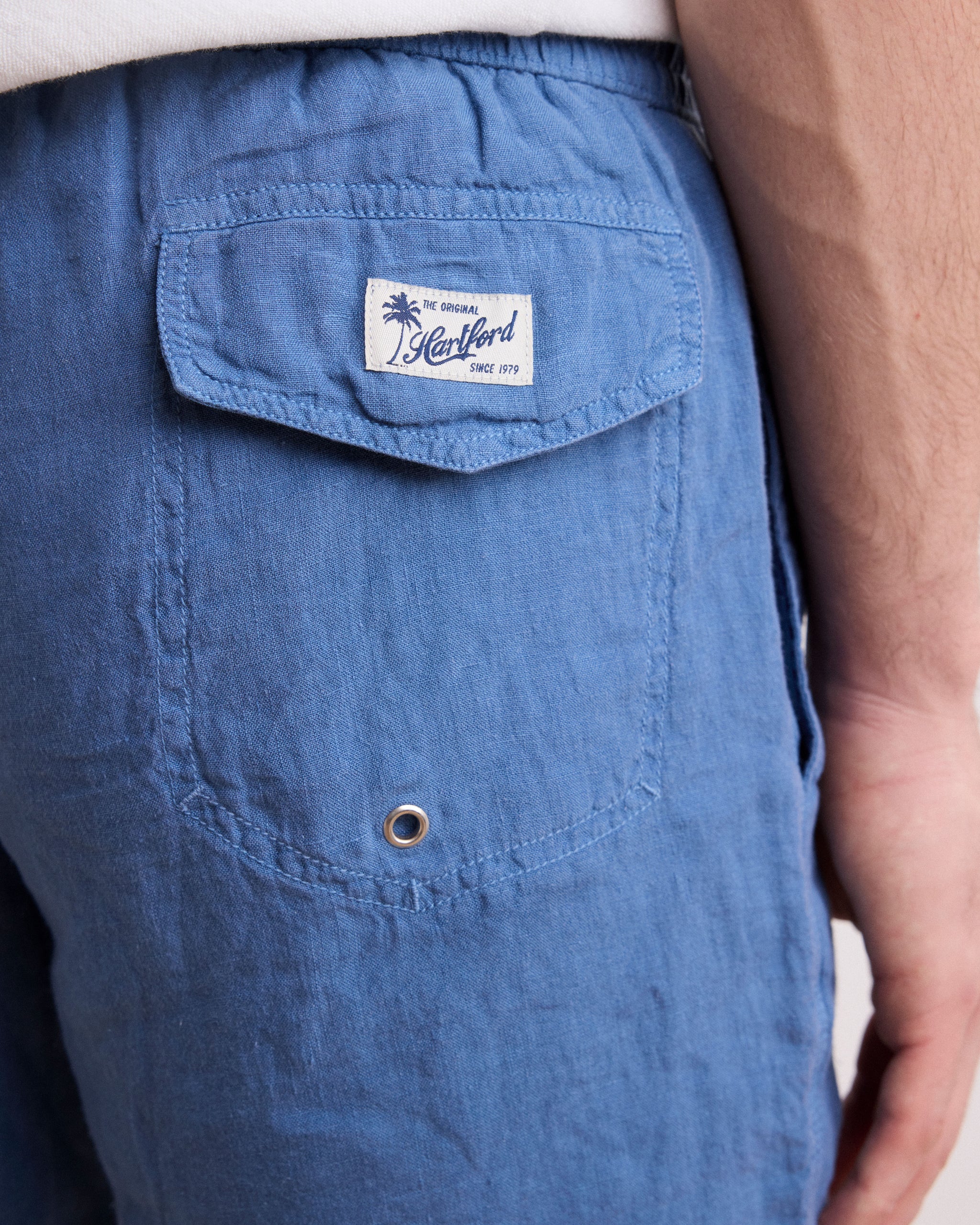 With an elastic waistband, side pockets and a back pocket. 100% linen harvested in France and woven in Europe. Color: Denim Blue. Chic and casual, suitable for everyday or vacation wear.