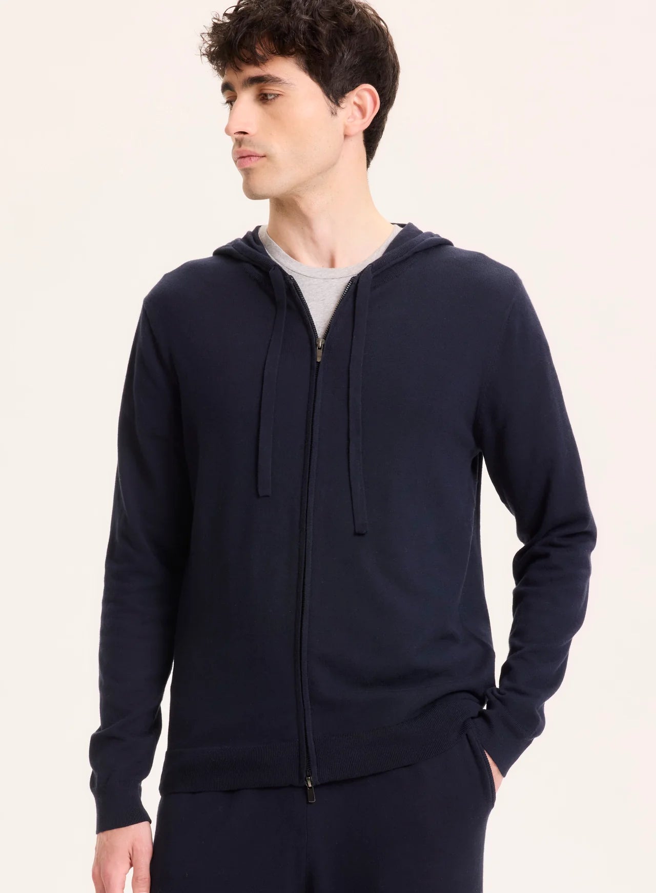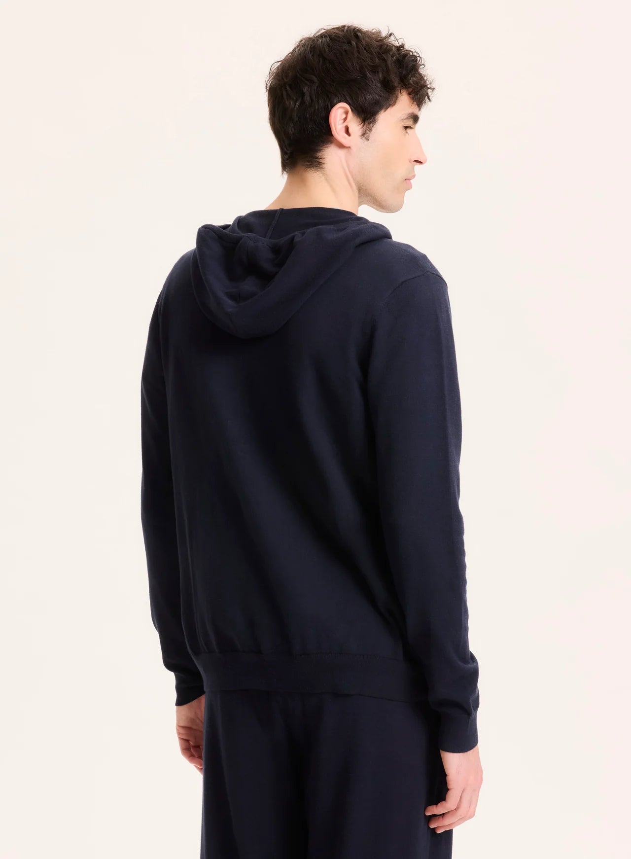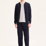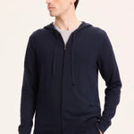 Navy hooded cardigan made from organic cotton and elastane. Soft, stretchy, and comfortable, it offers warmth and a relaxed, casual style.